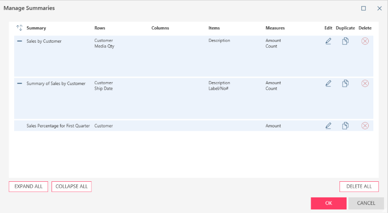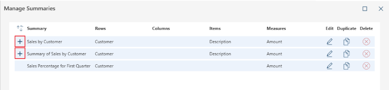 Once created, you can view the properties of your summaries, including the rows, columns, and measures the contain, edit them, duplicate them, or delete them. These are done via the Manage Summaries dialog.