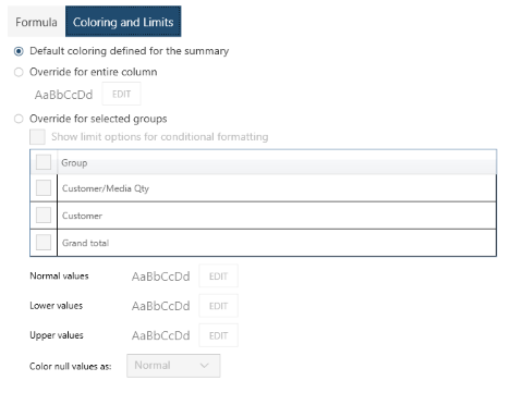 Default coloring defined for the summary: Select this option to use the defaults that have been defined in the Edit Summary dialog.