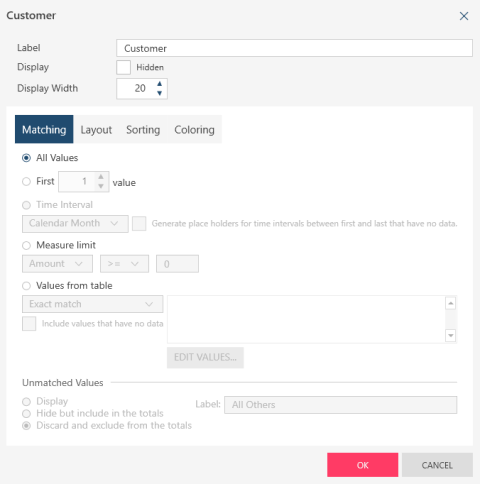 You can also modify the settings for the coloring and limits applied to the measure field by clicking the Coloring and Limits tab.