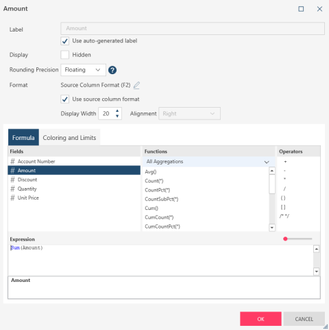 If you wish to modify the calculation applied to this measure field, enter a new calculation (e.g., any arbitrary expression involving addition, subtraction, multiplication, and division of values of numeric columns) into the Expression box.