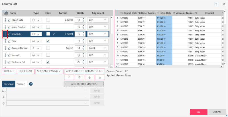 Moving a column using the Column List dialog