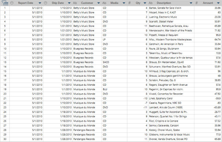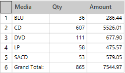 The summary in Figure 5 includes the Customer, Media, Quantity, and Description fields as key fields and the Amount field as a measure. This summary displays individual transactions for each media type within each customer. Subtotals are generated at both the Media level and the Customer level.