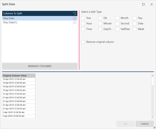 - The Extract and Split operations are available for multiple columns containing text and date/time data.