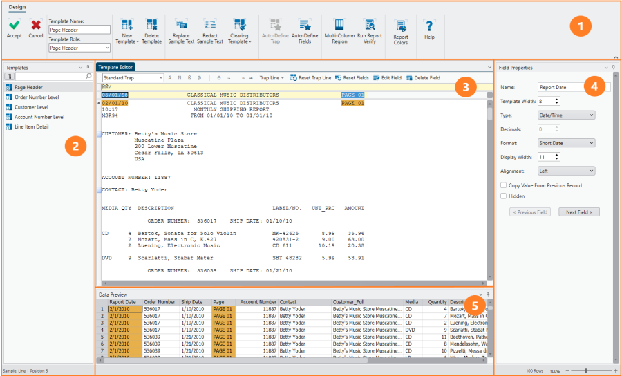 Ribbon Displays all the tools you need to work with a report template. Refer to the Report Design Ribbon Quick Reference |