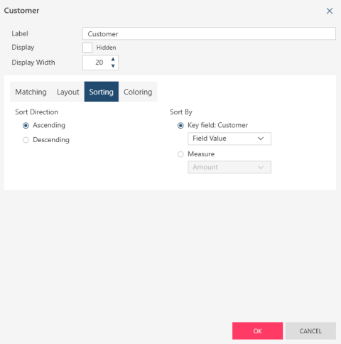 To sort the field based upon the values of a measure, select the Measure radio button. For example, to sort a Region field that contains several sales regions (North, South, East, and West) based upon sales totals, you would select the Measure radio button and then select the appropriate measure to sort on; in this case, the measure that tabulates the sales totals for each region.
