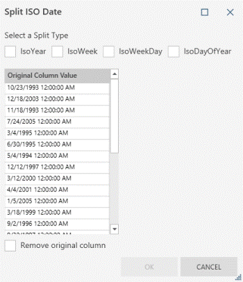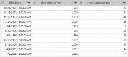 In this example, Hire Date is the original date/time column. We split this column into 2 columns by ISO year and by ISO week to get Hire DateIsoYear and HireDateIsoWeek.