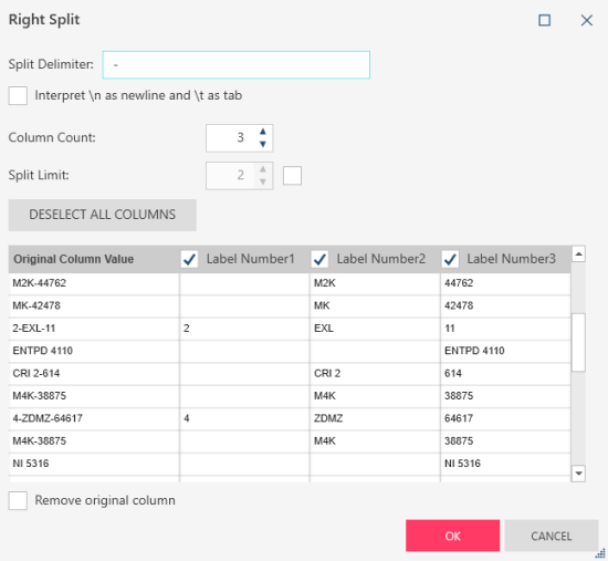 By default, all columns resulting from the split operation are added to the resulting table. However, in some cases, not all columns resulting from the split operation are useful to you. You can select specific columns to add to the table by clicking the Deselect All Columns button and then selecting which specific columns you wish to bring into the table instead.