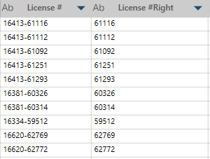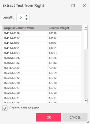 In this example, License # is the original column. Five characters from the right are extracted to produce the values in License #Right.