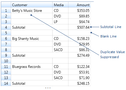 Key fields are used to generate the summary matrix. You select the fields that you want to tabulate, such as all customers or all product types in the order that you want to break out the field values. For each key field Monarch Classic produces a list of all values found within the field. The values are then combined with values from other key fields to create each line in the summary. For example, a Customer field with the values "Betty's Music Store" and "Big Shanty Records" and a Media field with the values CD, DVD, LP and SACD will produce six summary lines as shown in the illustration below.