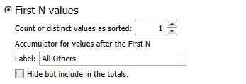 This option is applied after the summary is sorted. By selecting the Measure sort option (see the Measure option on the Sorting tab below), you can use this feature to display a top n analysis or bottom n analysis of your data. For example, you can use this feature to create a summary that breaks out total Sales amounts for each Salesperson in your company, then limits the summary to only the top ten salespeople. By selecting Salesperson as a key field and Sale_Amounts as a measure, you could then sort the Salesperson key by the Sale_Amounts measure (in descending order). This would result in a summary that displays salespeople ranked by total sales, with the top selling salesperson first and the bottom selling salesperson last. You could then select the First n Values option for the Salesperson key, setting n to 10. The resulting summary would display the top ten salespeople in terms of total sales, with all other salespeople grouped together under a single label (the "All Others" label). |