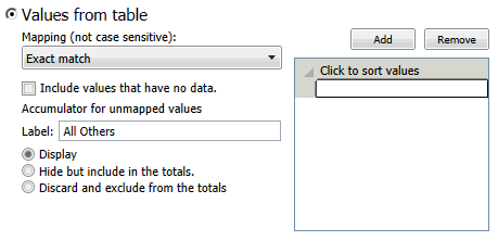 Click include values that have no data to include the value in the summary, even if there are no matching records found in the report. Accumulator for unmapped values label will be used to identify all values that are not included in the list. You can also select to display, hide, or discard all unmapped values. |