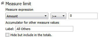 For example, when creating a summary to show product quantities broken out by Customer, you might want to view only those customers whose purchase amounts are greater than $5000.00. By selecting Customer as a key field and Amount as a measure, you could then select the Measure limit option, select Amount from its drop-down list, select the ">=" operator, and enter $5000 in the associated edit box. The resulting summary would display all customers that purchased more than $5000.00, with all other customers grouped together under a single label (e.g., the "All Others" label). |