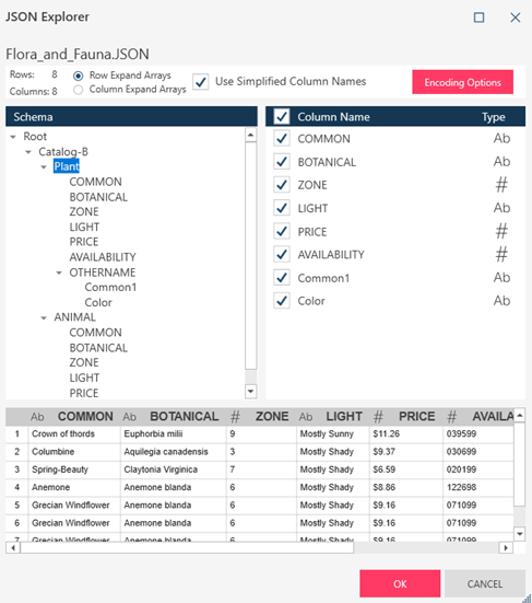 | Row Expand Arrays | When selected, instructs the application to transform an array of objects, where each object represents a row with potentially nested arrays, into a more normalized table structure where each element within those nested arrays becomes its own row. |