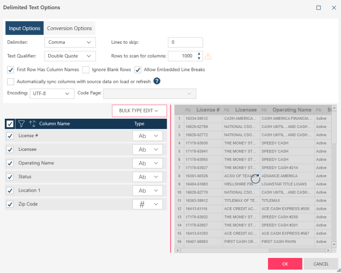 Specifies a single ("bulk") data type to apply to all fields in your data source. NOTE: Specific data types can be assigned for each of the columns in your delimited text file data source using the Type drop-down lists provided to the right of each column. This option is deactivated if Automatically sync columns with source data on load or refresh is selected. |