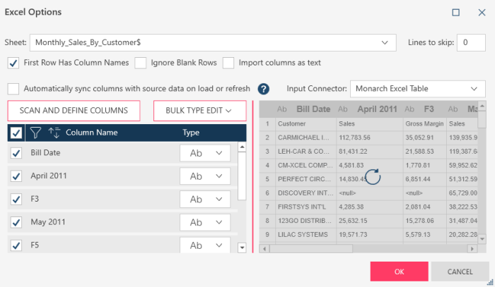 Specifies the connector type (i.e., Monarch Excel Table or Monarch ACE OLE DB (Legacy) to apply when the table is loaded. |