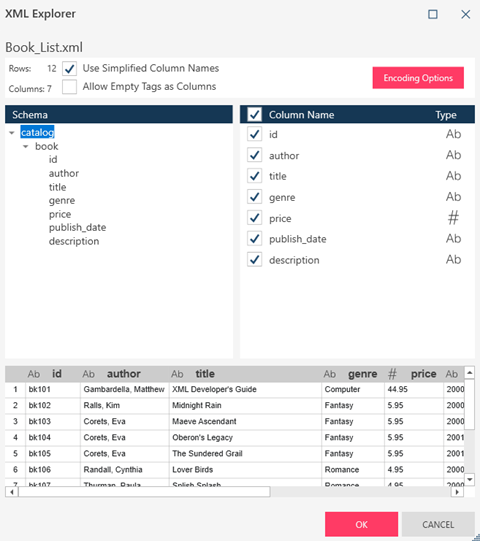 Specifies the encoding type to apply when loading the table into your workspace. The encoding types enabled for XML files include: