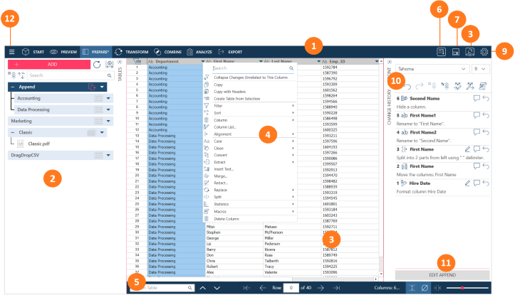 The standard Monarch Data Prep Studio Toolbar Select a tool to move to the Start Page, Preview Window, Transform Pane, Combine Stage, Analyze Drop-down, or Export Window. |