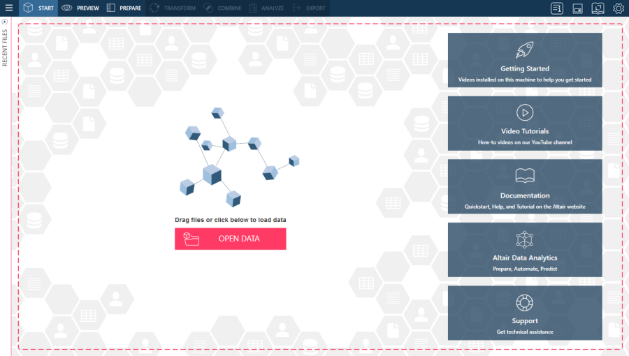 The Start Page displays when you start the Data Prep Studio application or when you select Start from the Monarch Data Prep Studio toolbar.