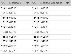 In this example, License# is the original column. We substitute the string "-" with the string " : " to get the values in License #Replace.