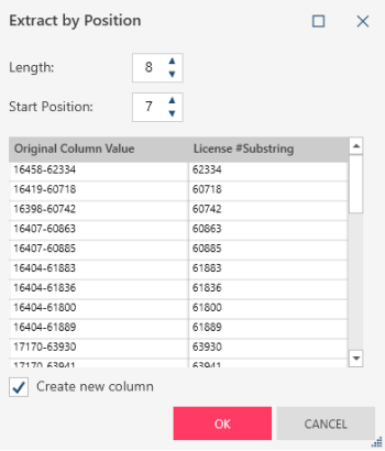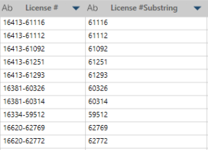 In this example, License# is the original column. Eight characters starting from position 7 are extracted to produce the values in License#Substring.