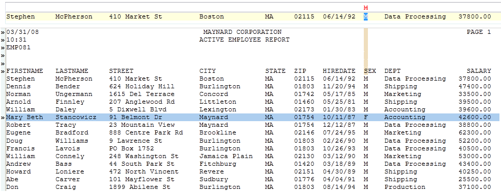 In the graphic below, note that the "M" in the trap line has been highlighted. Currently the "M" is trapping the data for only the male employees (note that for the sixth employee down, "Mary Beth Stancowicz", the data has not been trapped).