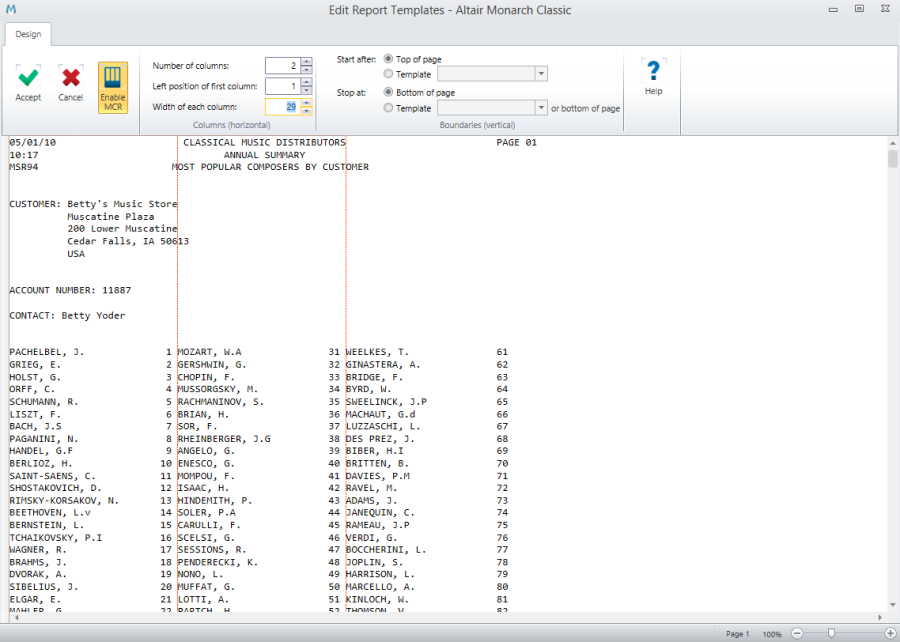 Monarch Classic's multi-column region (MCR) trapping capability enables Monarch Classic users to trap and extract data from reports that have a layout similar to that of a newspaper, i.e., ones with multiple, adjacent columns of data on each page.