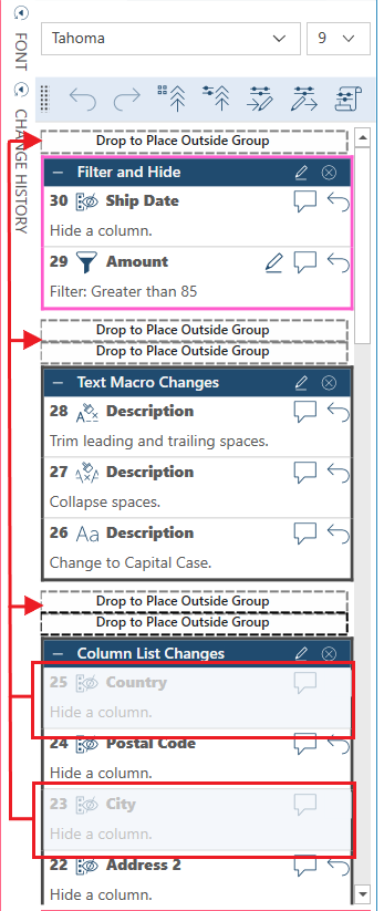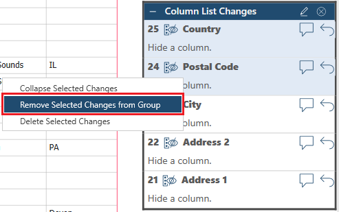 Most importantly, when a change is removed from a change group, assuming that the changes are independent of each other, the change is still applied to the column/table. By contrast, when a change is deleted from a change group or the Change History list, the change is reversed and the column/table to which it was applied no longer shows the results of the deleted change.