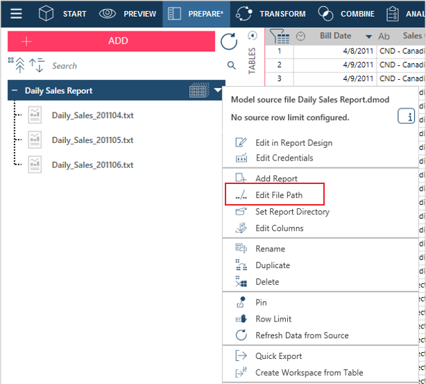 Edit a report's file path by selecting the drop-down beside the main table and selecting Edit File Path.