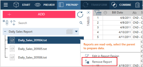 Data from reports associated with a Monarch Classic file are displayed as tables on the Prepare window but cannot be prepped.