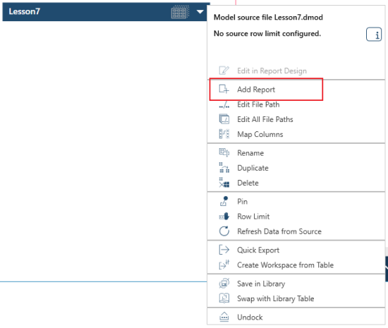 To view data, you must add reports compatible with the model. To do so, select the drop-down beside the main table and select Add Report: