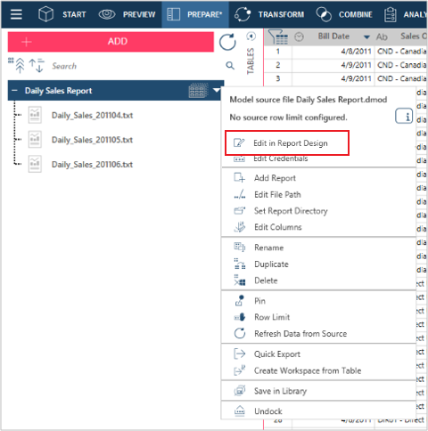 Modify the model associated with a Monarch Classic file by selecting Edit in Report Design.
