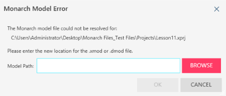 If you open a Project that uses a model that cannot be located, Monarch Data Prep Studio will display a dialog box telling you that the model cannot be found. Click the Browse button to look for the model and point the model to the correct location.