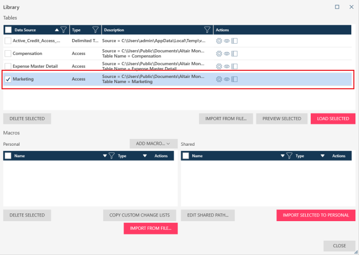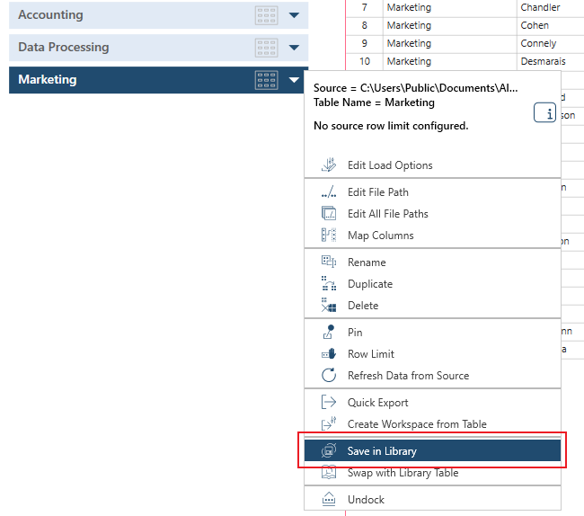 When you save a data source to the library, Monarch Data Prep Studio also preserves path or location of the source. You can then use the library to easily access and include commonly-used data sources as you define workspaces, without having to open the data source and load tables.