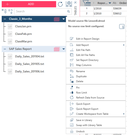 Note this interface is common for all tables, no matter if the data source is a report, XML,JSON, PDF, Excel, or database. However, the context menus may vary slightly and these variations are discussed below.