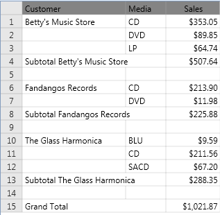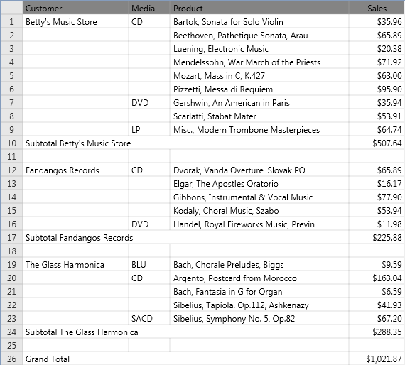Collapsing and expanding (referred to as drilling up and drilling down, respectively) provide quick ways of exploring a summary data set. By collapsing (drilling up) you reduce the level of detail in the summary, revealing higher level information. For example, the following summary breaks out sales by media type within customer. Sales totals are displayed for each media type within each customer. By collapsing the summary, Monarch Classic combines the sales totals for each media type to display a single sales total for each customer.