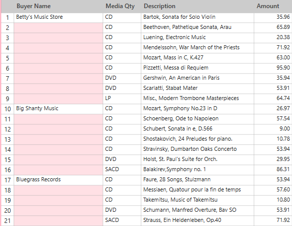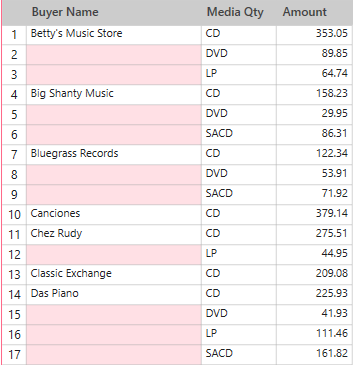 Collapsing and expanding (referred to as drilling up and drilling down, respectively) provide quick ways of exploring a summary data set. By collapsing (drilling up) you reduce the level of detail in the summary, revealing higher level information. For example, the following summary breaks out sales by media type for each customer. Sales totals are displayed for each media type within each customer. By collapsing the summary, Monarch Data Prep Studio combines the sales totals for each media type to display a single sales total for each customer.