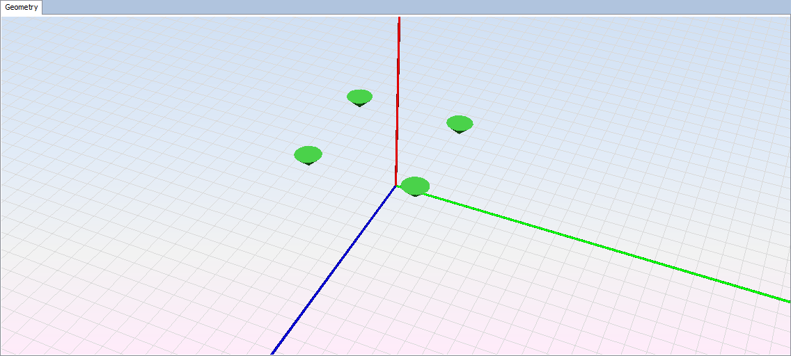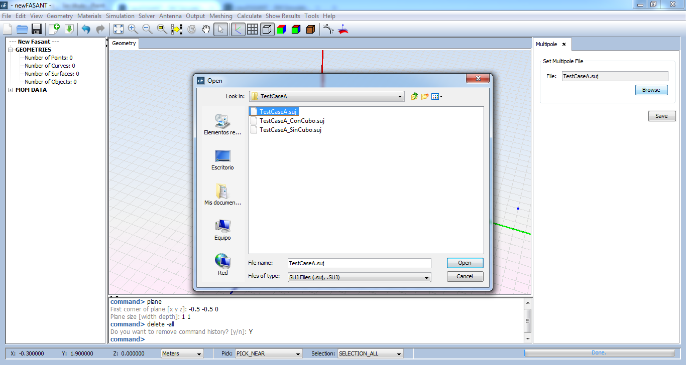 Step 10: Delete the geometry model, the antena and the observation plane. Then set the multipole file saved as antenna selecting 'Antenna --> Multipole Antenna' option and selecting the '.suj' file saved en the step 9. Then click on 'Save' button and the multipole appears as green cone.