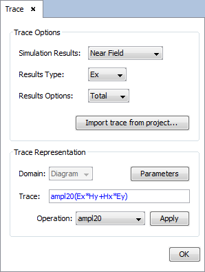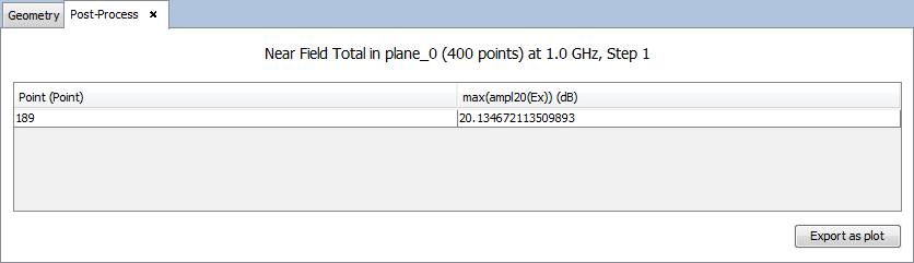 Select 'Show Results --> Post-Process' option to calculate the maximum field value of the plane observation. To see the result as a table, select 'table' on the selector of 'New Trace' option and click on 'OK' button.
