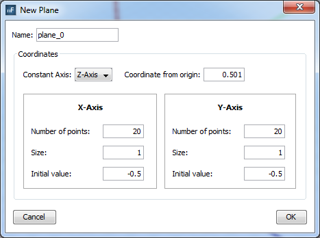 To add a plane visualization, select 'plane' on the selector of 'Geometry Types' section and click on 'Add' button. The plane parameters panel will appear, then configure the values as the next figure show and accept it clicking on 'OK' button.