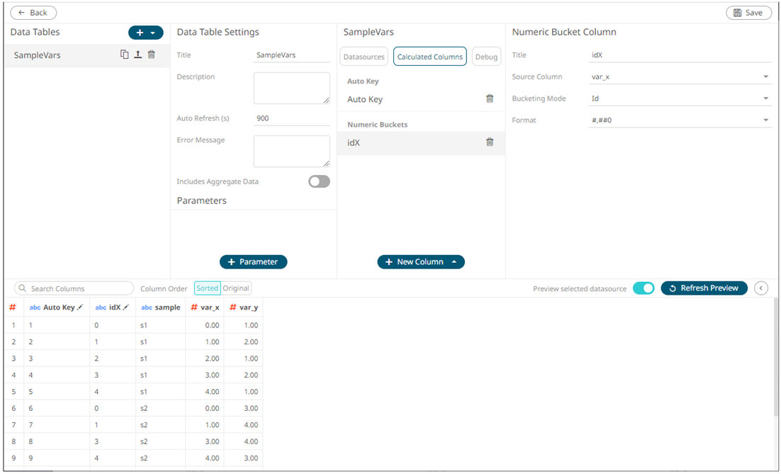 - Create a Numeric Bucket column of type "Id" (unique values), based on the X-variable column
