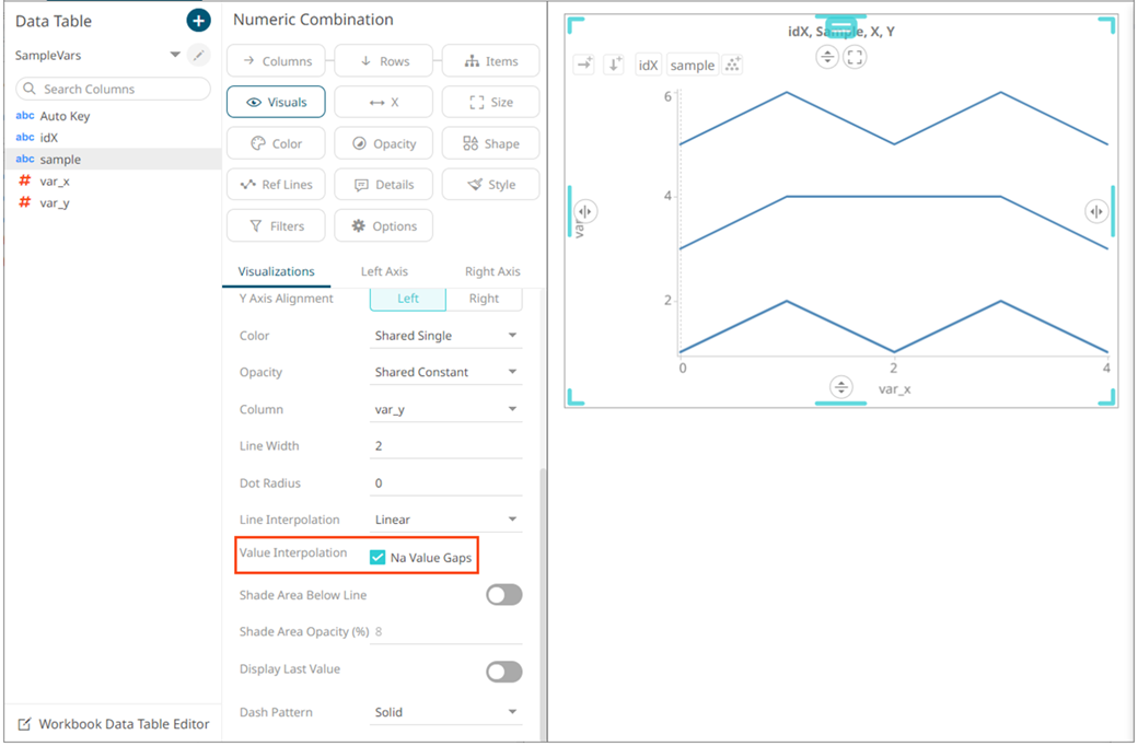 With the above settings in place, you will get separate lines per each sample identity. You will then also be able to color those line by the sample identity. If your dataset has missing values, for one or several of the samples/series, you can bridge those value gaps by switching on interpolation of NA value gaps on the Y-variable.