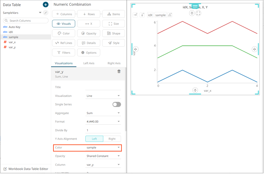 When you want to visualize several samples, or series, as lines of the same numeric variable in the Numeric Combination Graph, there is a requirement that you do the following: