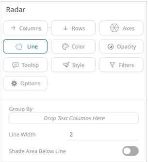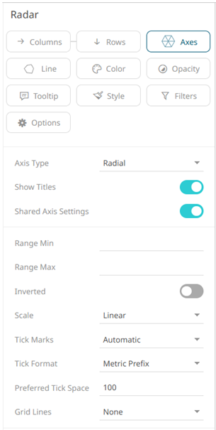 By drag-dropping a numeric or text column on the Axes pill or on the Axes stack, a radar visualization will immediately appear, and the automatic values will be set for the Range Min and Range Max fields.