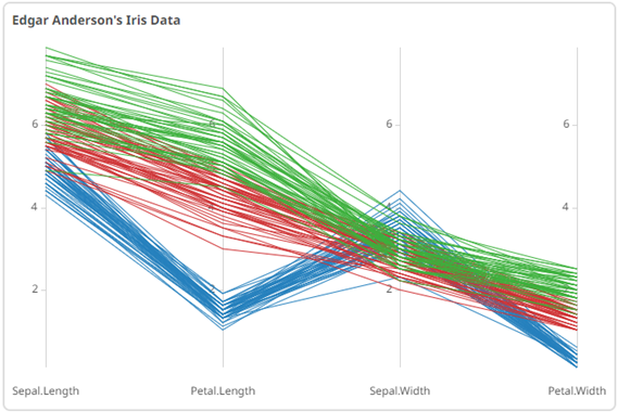 - Several numeric variables are visualized with a line drawn between axes where each axis represents one numeric variable.