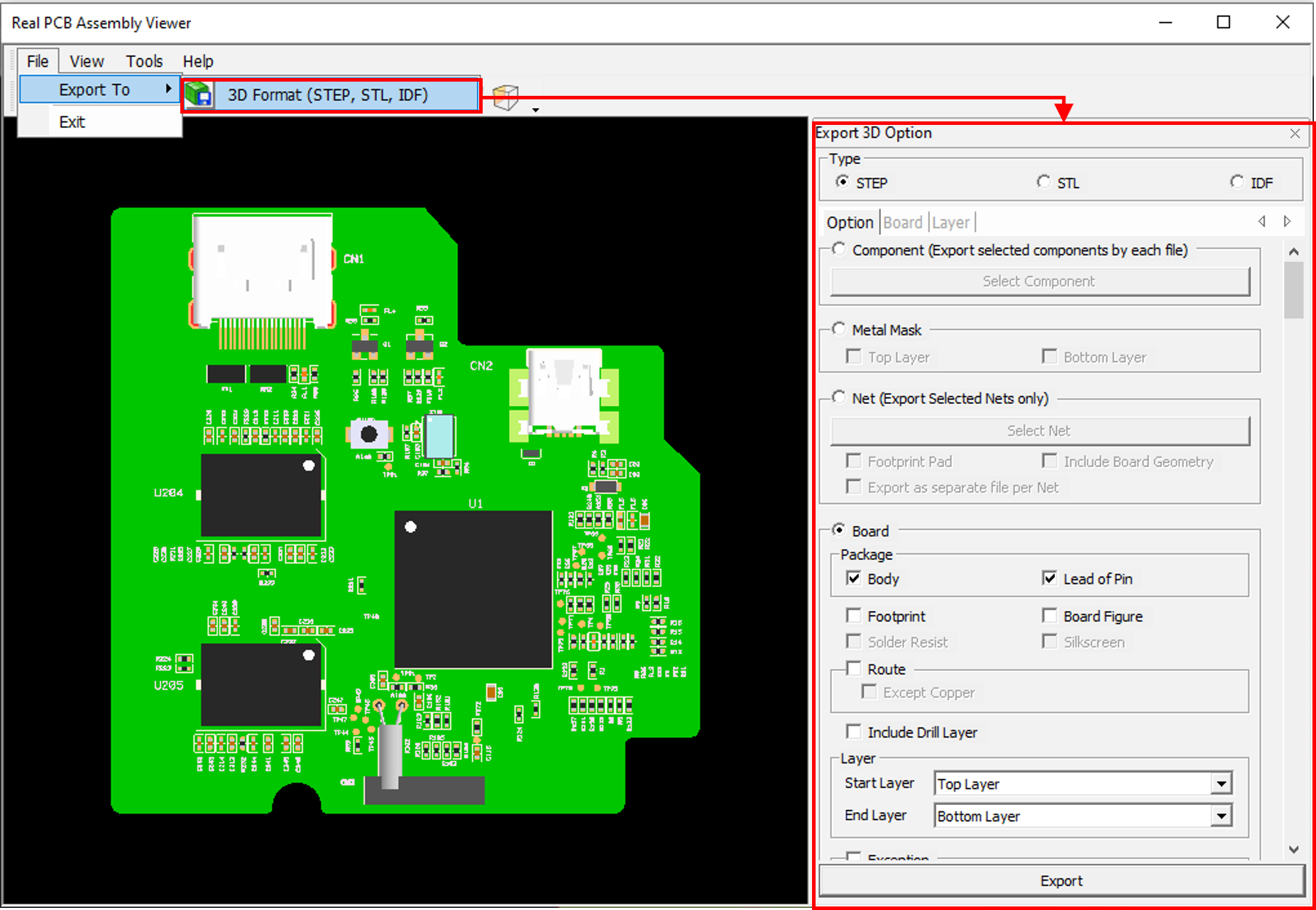 - Net (Export Selected Nets only): Option to export the selected Net as 3D
