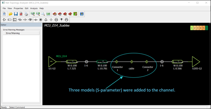 And S-parameter models of cables and connectors can be inserted between the TX and RX for SerDes simulations. In the Net topology Analyzer dialog, if the user adds S-parameters as shown in the diagram below, it is possible to evaluate the statistical eye and bathtub considering the losses caused by cables and connectors in the channel.