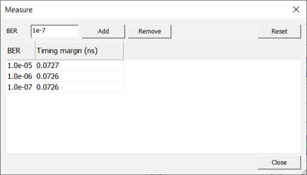 Users can measure the timing margin or voltage margin by pressing the Measure button at the desired Bit Error Rate (BER). Below are example results of timing margin measured at three different BERs (1.0e-05, 1.0e-06, and 1.0e-07).