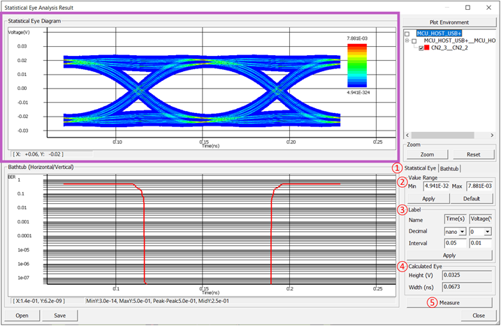 The following is an example of a statistical Eye Diagram obtained through the SerDes function of a specific differential line. The statistical Eye Diagram is located at the top of the Statistical Eye Analysis Result dialogue and is marked with a purple box below.