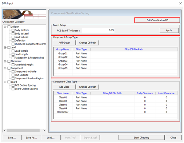 In the DFA Input dialog, you can change its mode to Component Classification Setting mode. Using this mode, you can set default stack-up thickness and classify component groups or classes that will be used in DFA checking.