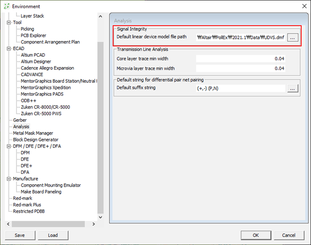 IO buffer device models of input and output pins of signal nets are stored in the part data file of individual components. When the device models are not available in the part data, the default linear device models defined here are used for transient simulation of signal integrity analyses. With the use of Linear Device Modeler, you can create linear output (driver) and input (receiver) device models and store them in a linear device model file. PollEx DFE+ provides you with a system default linear device model file, UDVS.dmf.